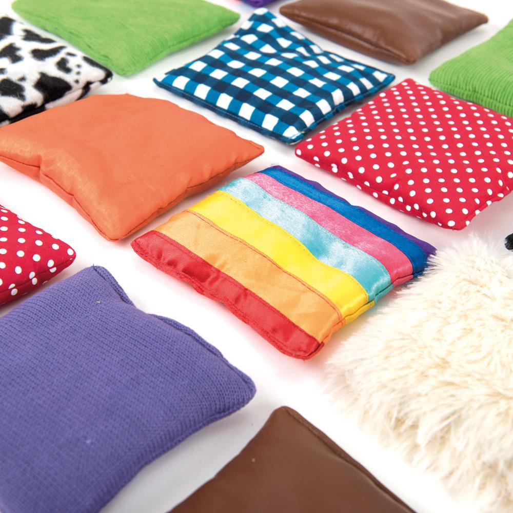 Eine vielseitige Sammlung von Fühlsäckchen aus verschiedenen Stoffen, speziell entwickelt zur sensorischen Entdeckung und zur Förderung von Fähigkeiten bei kleinen Kindern. Geeignet ab 12 Monaten.